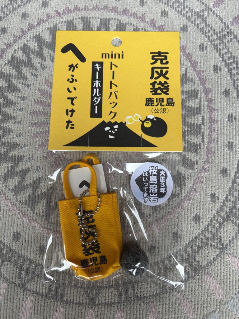 鹿児島県民なら誰もが知る、あの黄色い「克灰袋」🛍️そのミニチュア版の中に入っているのは、なんと大正3年の大正大噴火で流出した本物の「桜島溶岩」です😳! 100年以上前の火山の鼓動が、自分の手のひらに収まるサイズに……🫴これぞ鹿児島ならではのセンスですよね😅