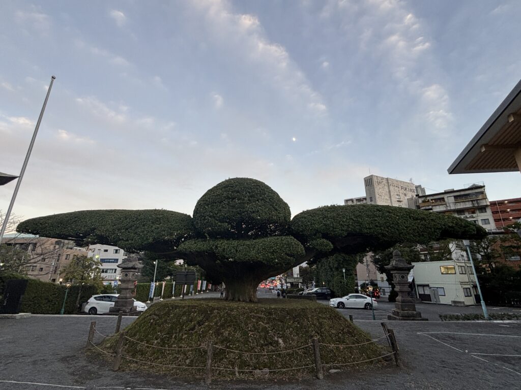 照國神社の入り口に到着すると、まず目を奪われたのは、まるで鳥のような形に剪定された大きな樹木です🦅