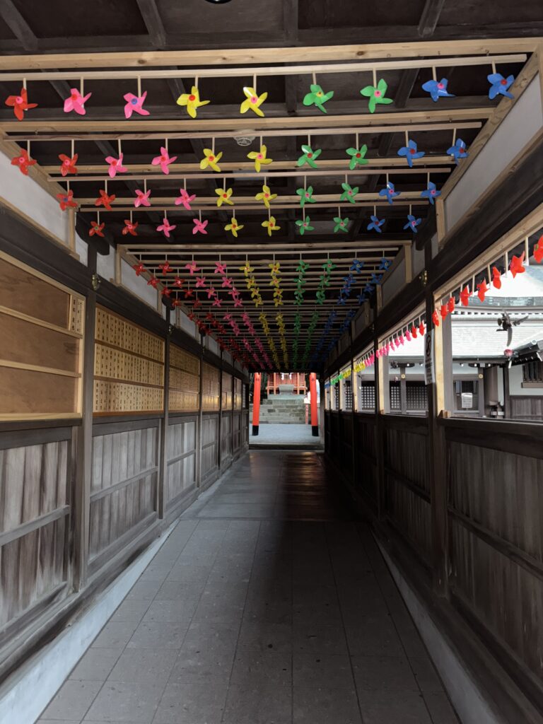 赤、黄、緑、青…と色とりどりの風車が並ぶ光景は圧巻で、「これは今流行りの映え写真を撮るところかな?」と思いました📷歴史ある神社の中に、こんなポップで楽しい空間があることに、現代の賑わいを感じました😃
