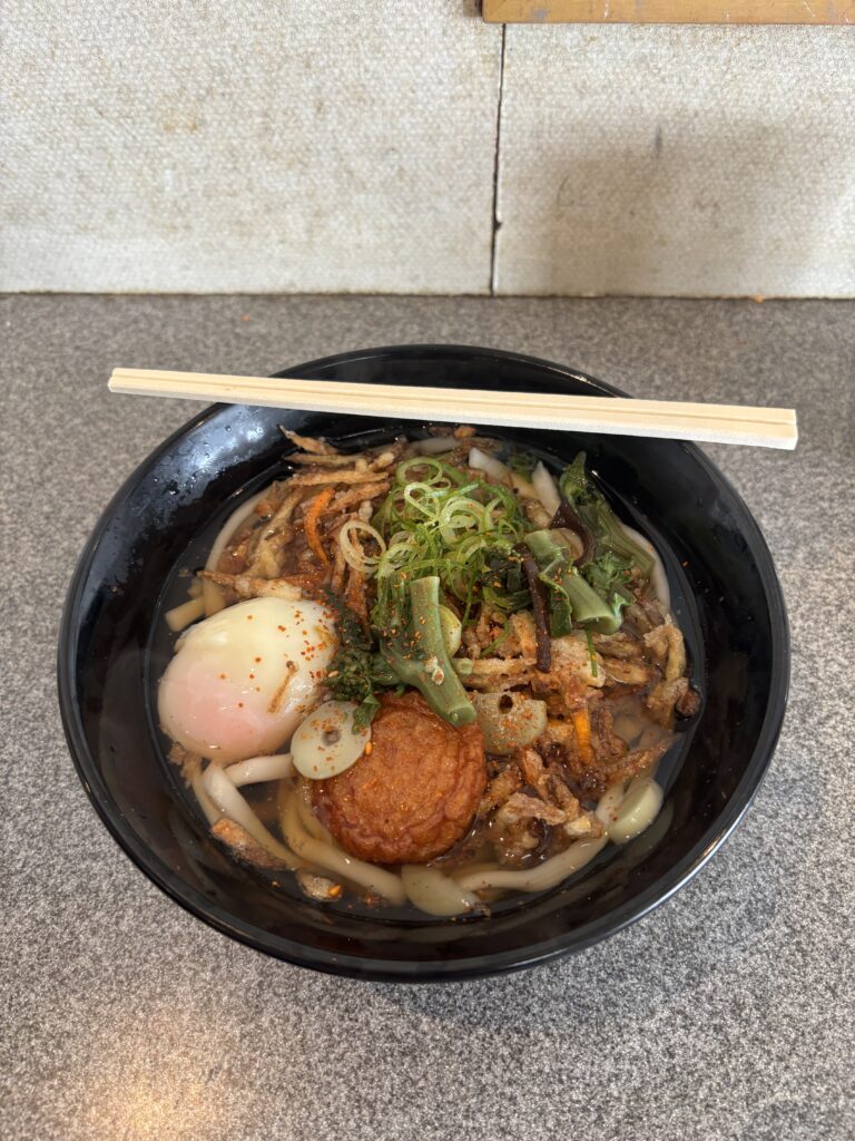山菜・温玉・ごぼ天が全部乗せになった名物「桜島うどん」 が注文してすぐに提供されました😳