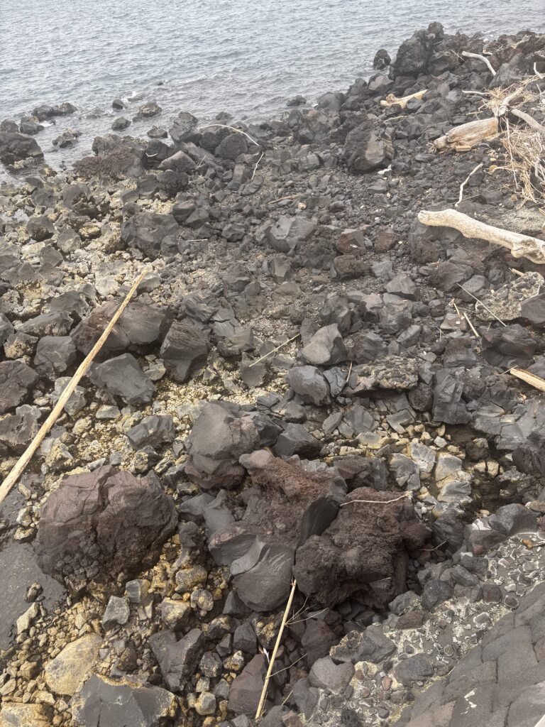 足湯のそばには、ゴツゴツとした黒い岩が大量に転がっています🪨🪨