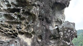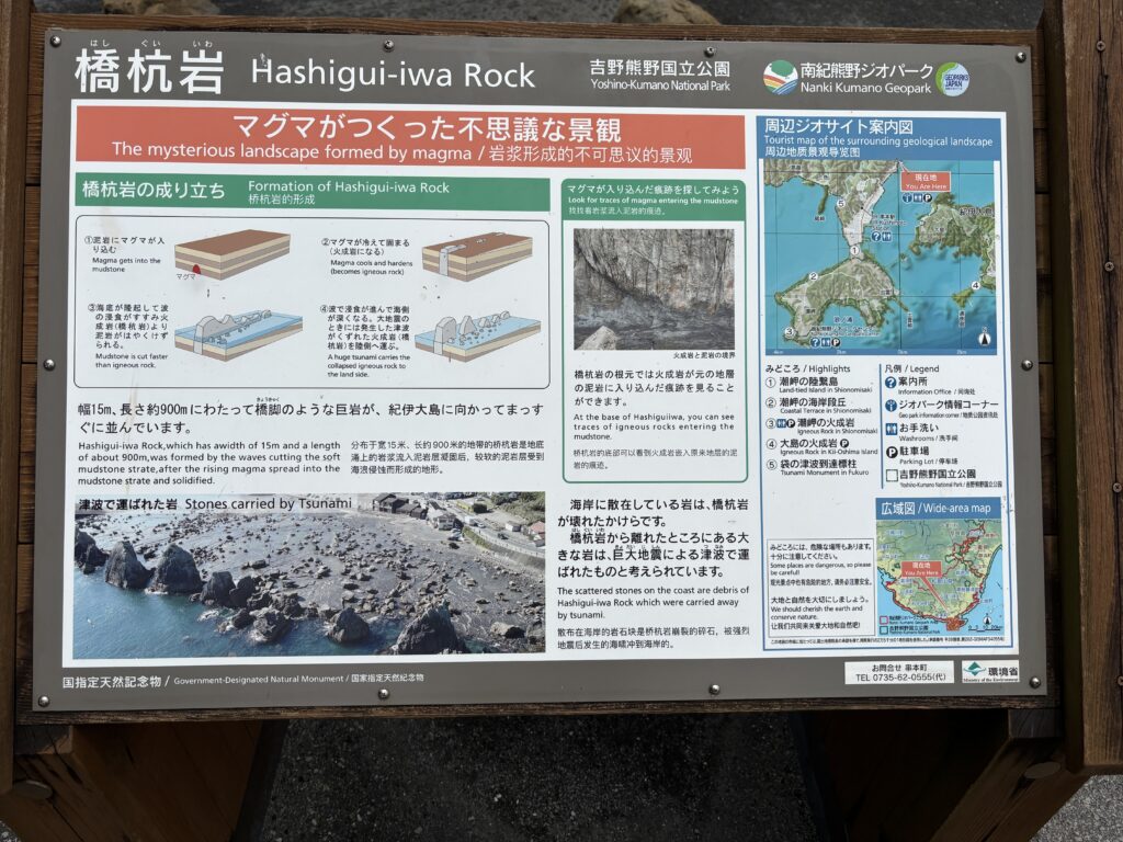 この岩、どうやってできたんだろう?🤔と疑問に思っていたら、道の駅の横に詳しい説明書きの看板がありました📜観光客の皆さんが入れ替わるタイミングを見計らって、じっくり拝見😯「マグマが堆積岩の地層に細長く入り込み、やわらかい堆積岩が侵食されて、硬いマグマの部分だけが残った」という説明に、「なるほど、こんな感じでこの岩岩が出来たのか!😧」と感心しました😙国の天然記念物であり、吉野熊野国立公園の一部としてジオパークにもなっているというのも納得の、大地のロマンを感じる場所でした!🙂↕️