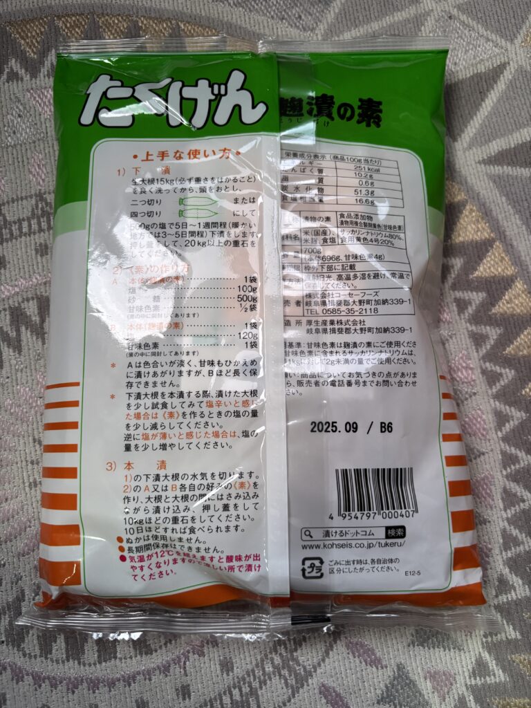あまりに美味しかったので、自分で作ってみようと、隣に売っていた【たくげん】という米麹で漬け込むだいこん漬の素を買っておいてよかった😂