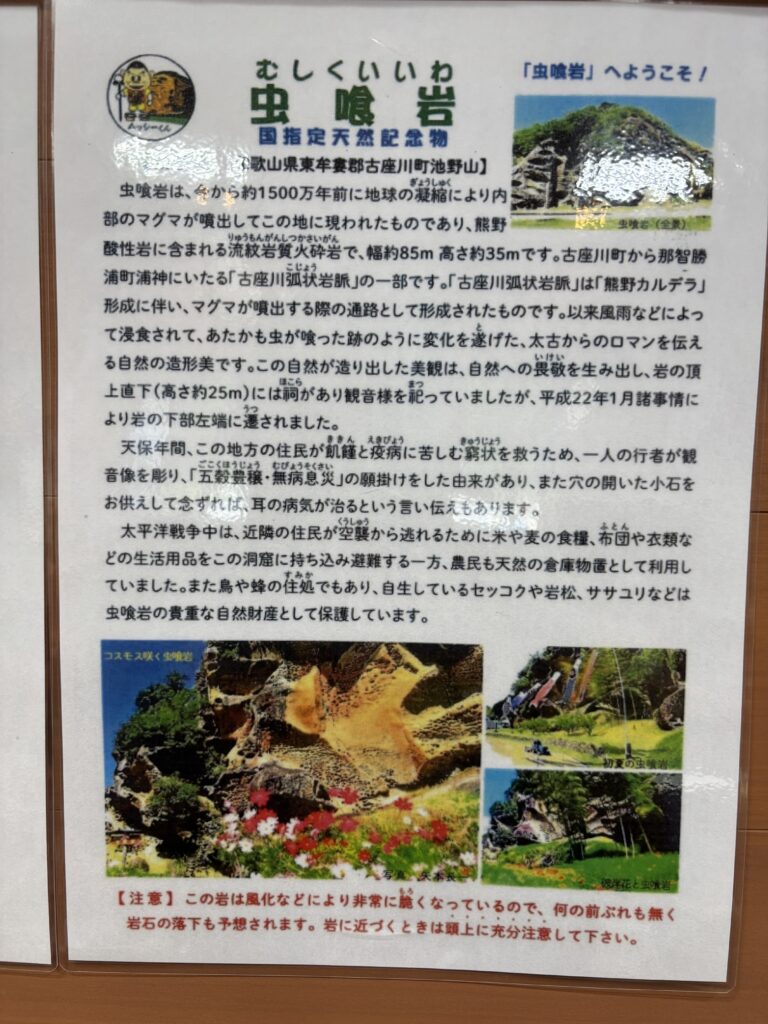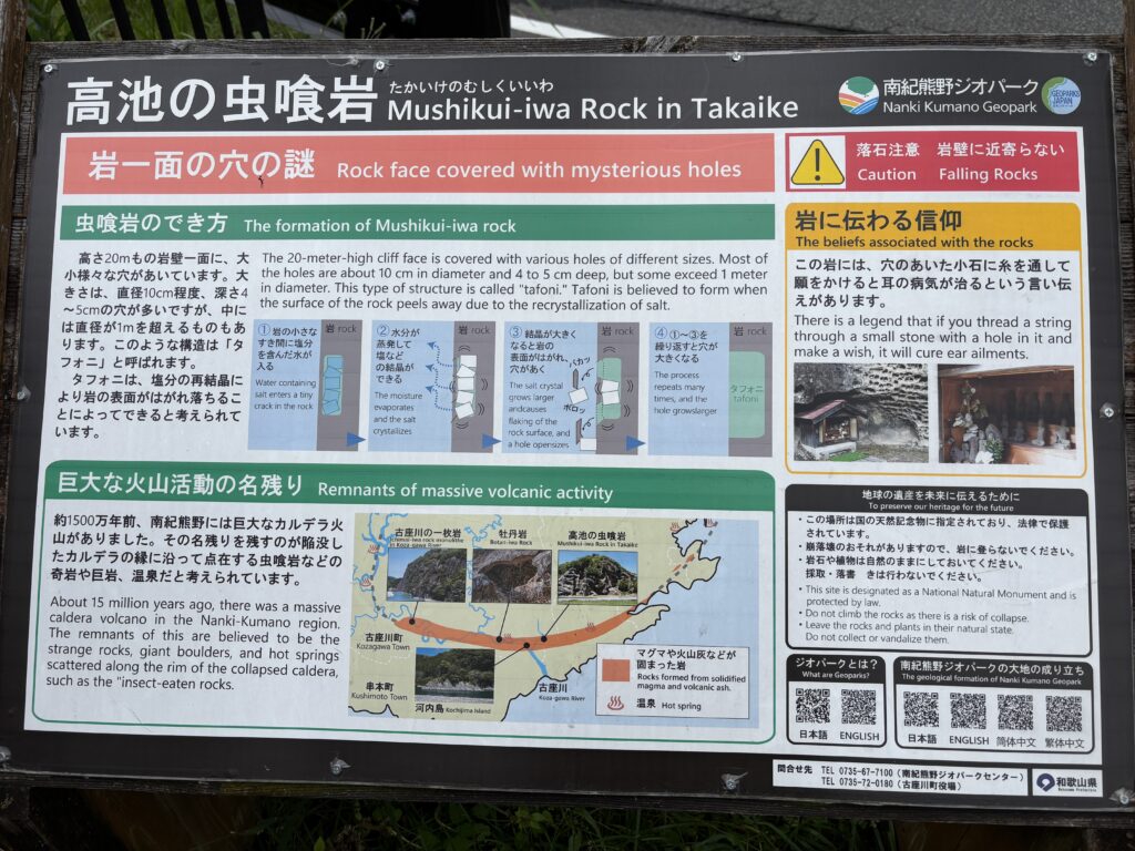 説明書によると、この虫喰岩は、約1500万年前の巨大な火山活動の痕跡なんだそうです🌋無数の穴は、岩に含まれる塩分が溶け出してできる「タフォニ」という構造で、地質学的にとても貴重なもの👨🎓南紀熊野ジオパークの一部にもなっているとのこと😏読んで「なるほど!」と納得😶太古のロマンを感じましたね😉