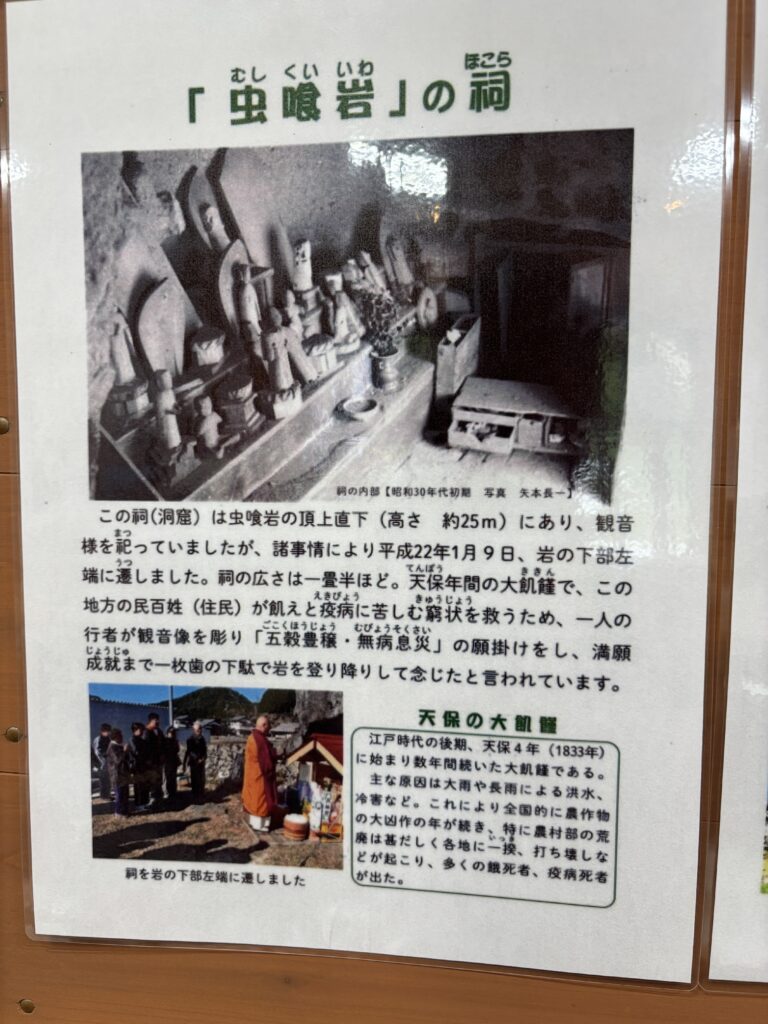あの穴は元々「虫喰岩の洞」と呼ばれる祠で、観音様が祀られていたそうです🙏特に天保の大飢饉の際には、病や飢えに苦しむ人々を救うため、岩の上まで登り降りして祈ったという歴史があるんですね🙏🙏🙏ただ、諸事情で平成22年に現在の場所(岩の下部左端)に観音様を遷座した、ということでした😲かつてあの岩の上で人々が祈りを捧げていたんだと思うと、感慨深いものがあります😌