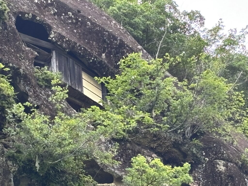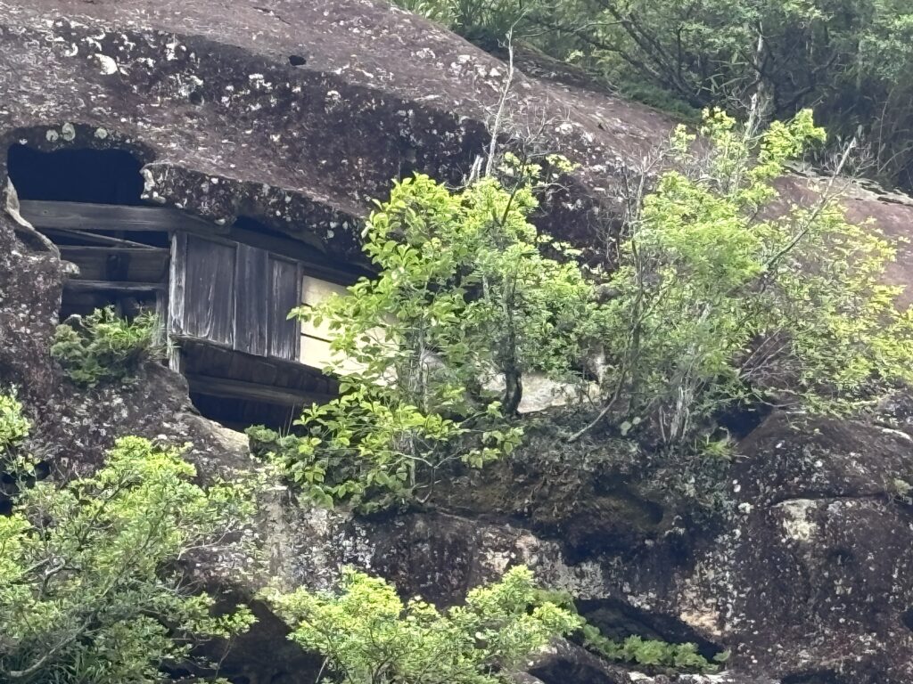 そして、岩を見上げていると、頂上近くの大きな穴の中に、木造の建物らしきものが見えるんです🙄