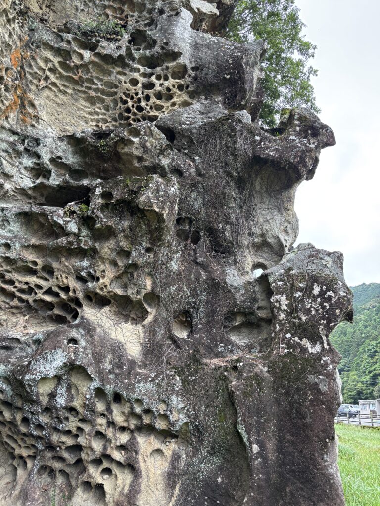 道の駅に着く前から、その巨大な岩壁に無数の穴が開いているのが見えていて、もうワクワクが止まりませんでした!🥰車を停めて、早速岩の方へ🚶♂️➡️