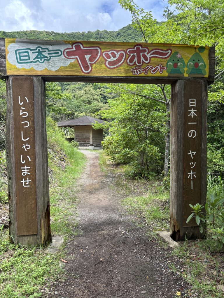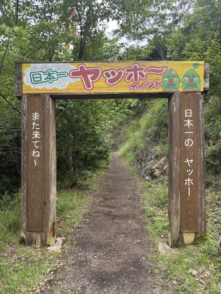 木々に囲まれた階段を登っていくと、ついに目的地に到着です!😙「日本一のヤッホー」と書かれた木製のアーチをくぐると、目の前にはヤッホーポイントの看板が🤭