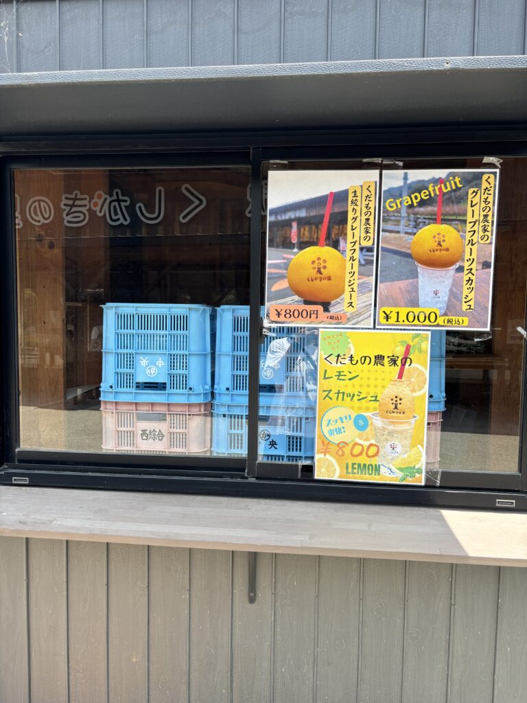 この道の駅、SNSで話題のグレープフルーツジュースが有名なんです!🤩カップの上に丸々一個のグレープフルーツが乗っていて、そこにストローが刺さっているという、インパクト大のドリンク😳これは絶対飲みたい!😋と意気込んで行ったのですが、なんと…この日は販売がお休みでした…残念!😭