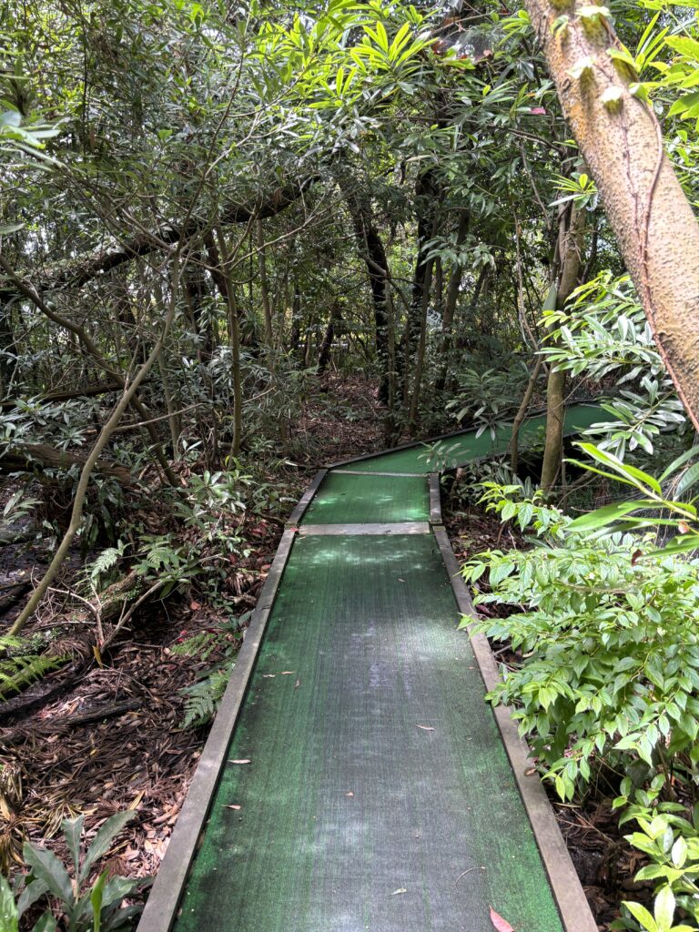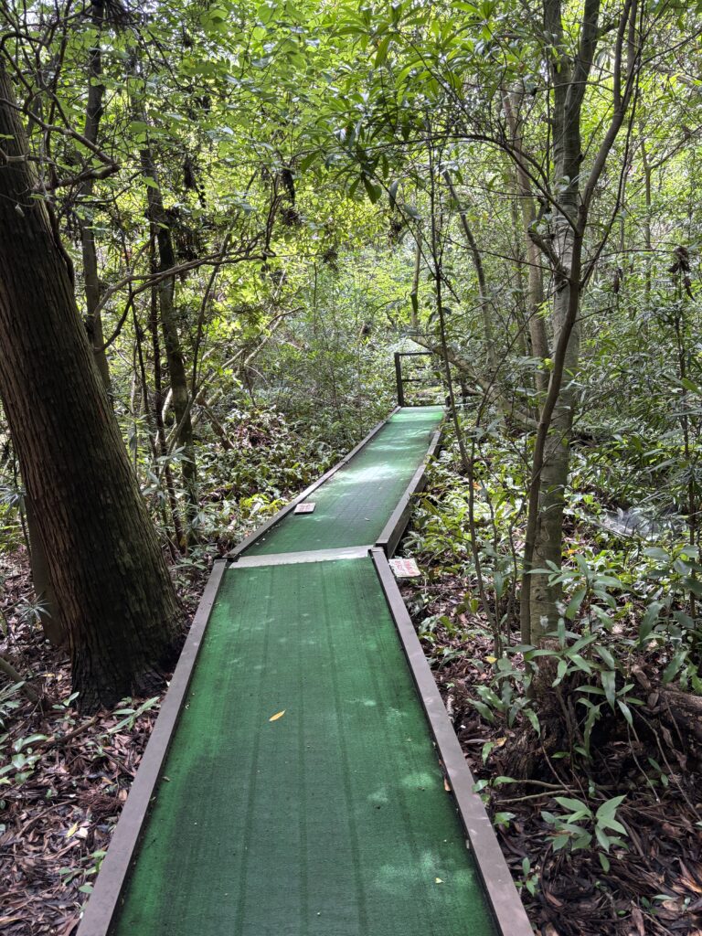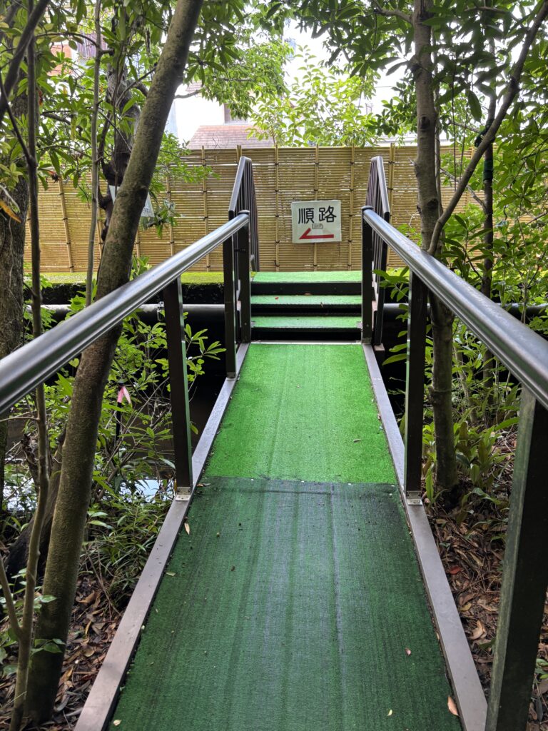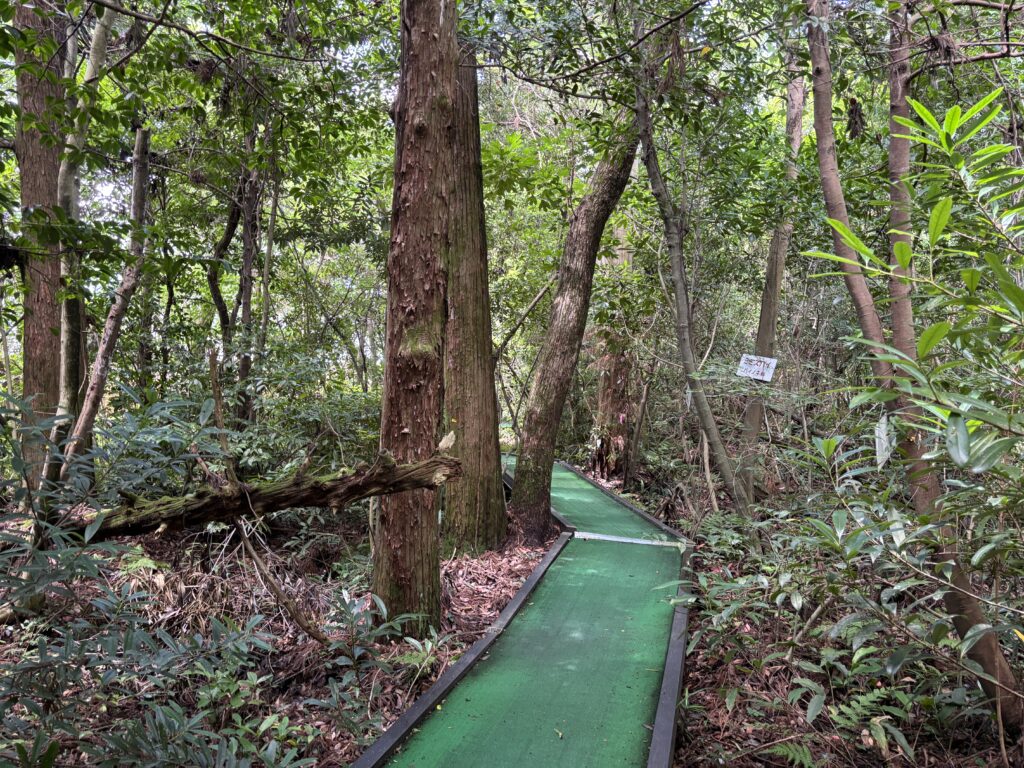 足元は緑の人工芝が敷かれていて、左右には鬱蒼とした木々が生い茂っています🥸