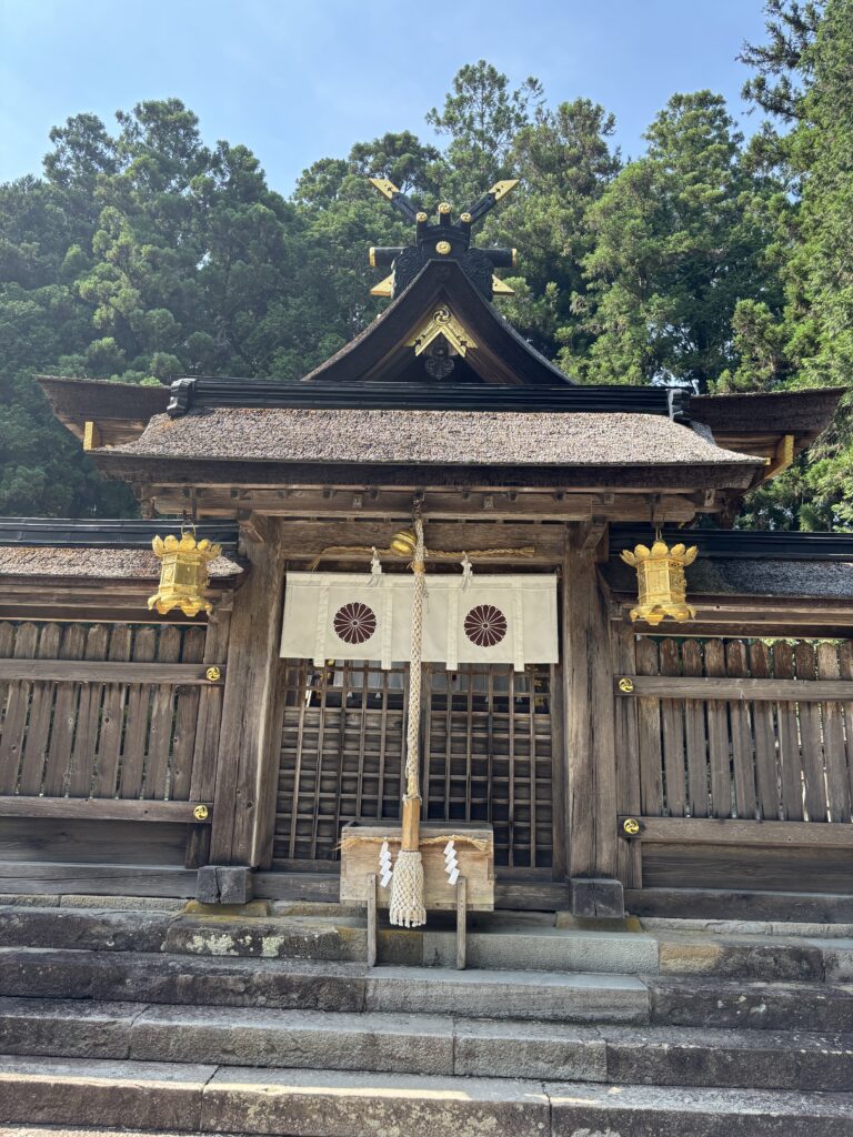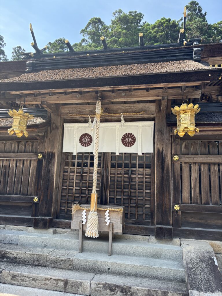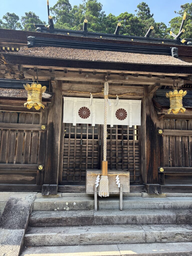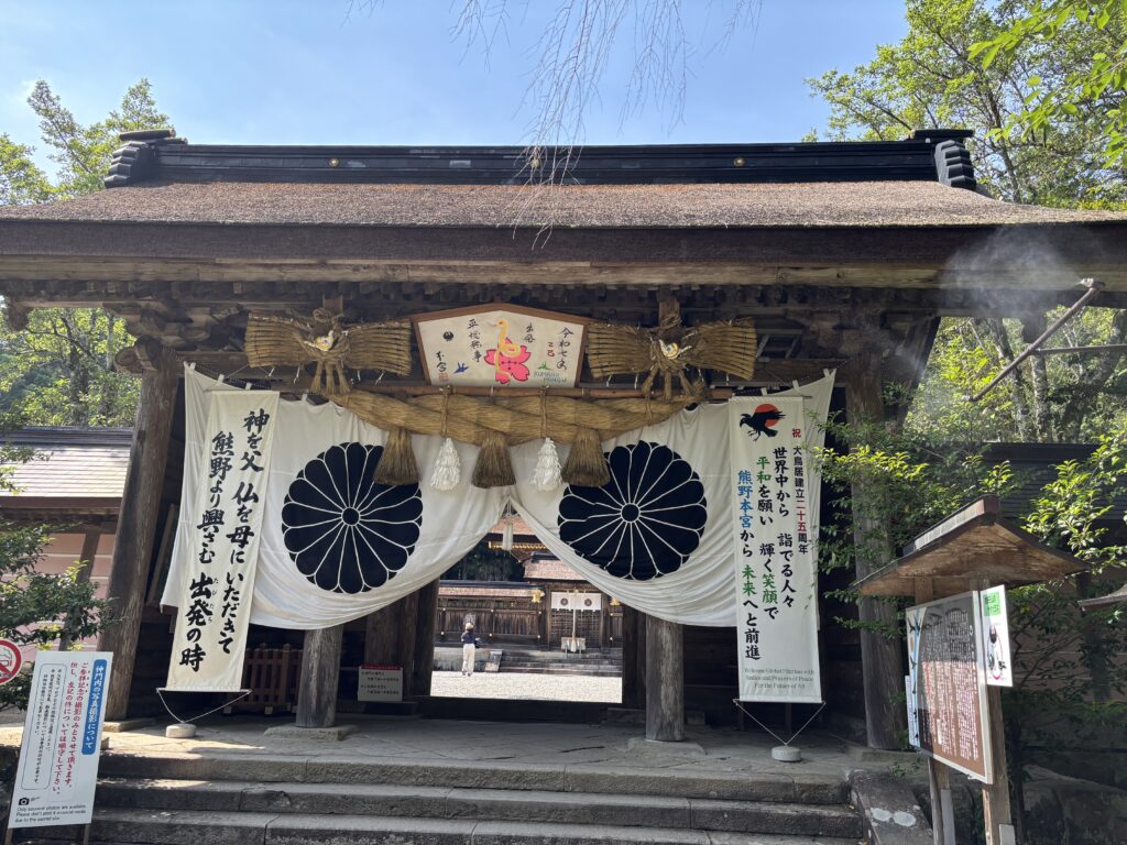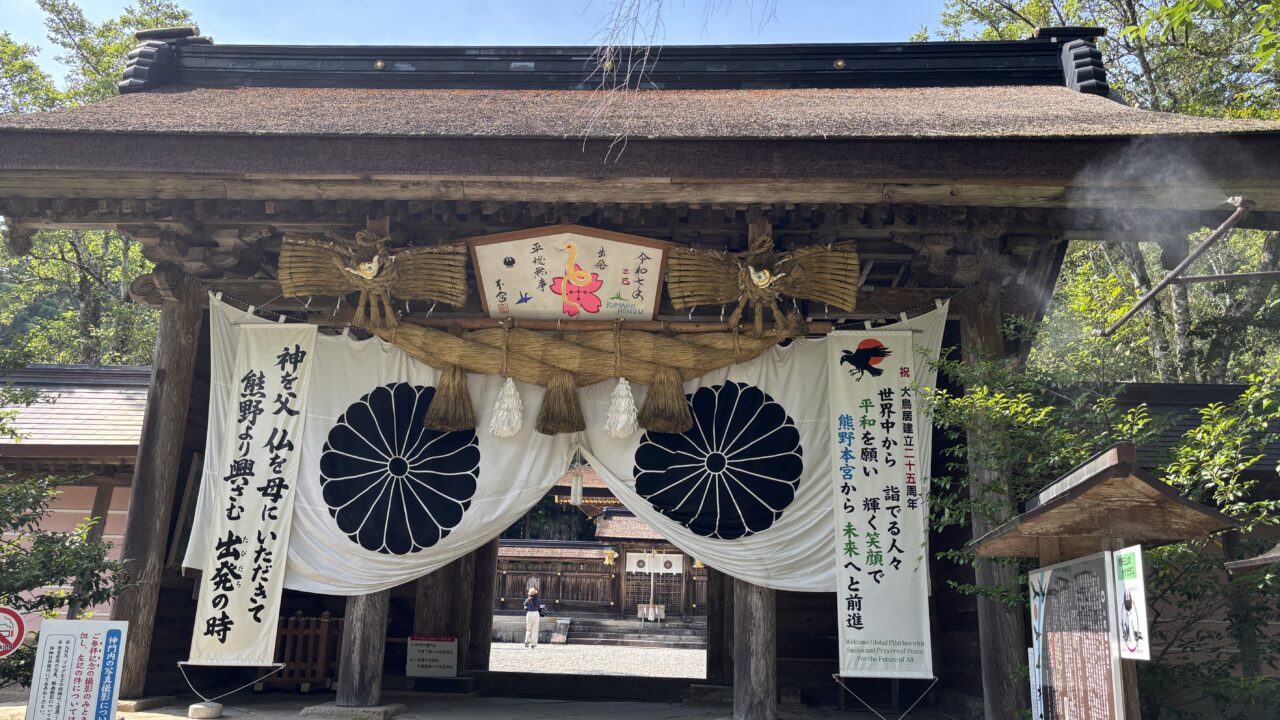 いよいよ、熊野本宮大社の本殿へ!😁その威厳ある姿は、目の前にすると言葉を失うほどだったよ😲特に目を引いたのが、入り口にかかる大きな白い垂れ幕hahた🏳️そこには、日本の皇室の紋章である十六葉八重表菊形が描かれていて、なぜ神社にこの紋章があるんだろう?と不思議に思ったんだ🤔