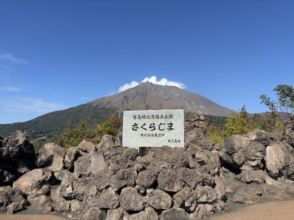 この石碑の後ろにドーンと構える桜島の姿は、まさに圧巻の一言🌋 火山のエネルギーを凝縮したような剥き出しの山肌が、太陽の光を浴びて神々しく輝いています🤩