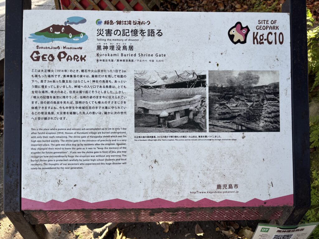 なんと、たった一日で2メートルもの灰がこの集落に降り注いだのだそうです🌫️ もともと3メートルあった鳥居は、そのほとんどが灰の下に閉じ込められ、最上部の「笠木(かさぎ)」の部分だけが、かろうじて地上に顔を出している……😧この光景を目にした時、私は火山の持つ「また別の恐ろしさ」を心の底から実感しました😨