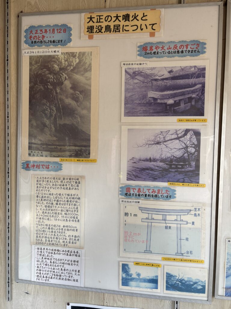 腹五社神社の由来から、大正大噴火当時の生々しい写真、さらにはどのようにして鳥居が埋まっていったのかという詳細な図解まで、とても分かりやすく展示されていました😀
