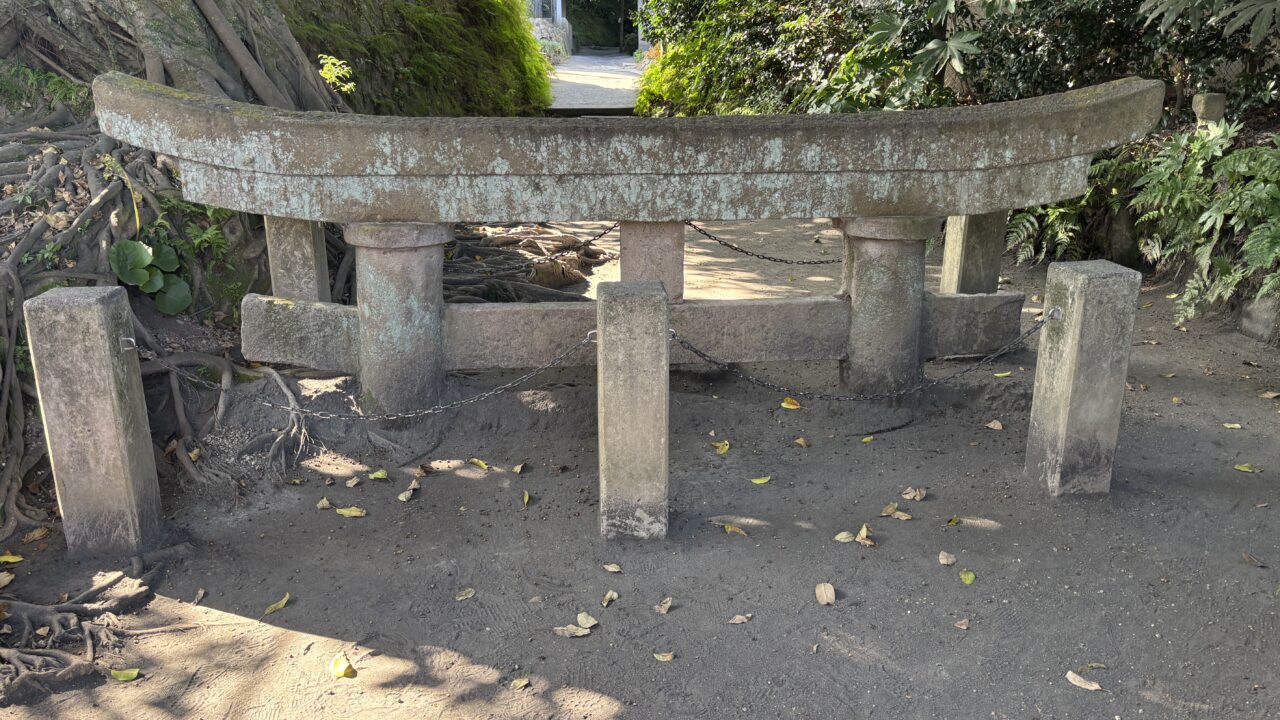 遊歩道を歩き、その場所にたどり着いた瞬間、全身に鳥肌が立ちました😖 目の前に現れたのは、地面からニョキッと頭だけを出した、あまりにも不自然な姿の鳥居です⛩️
