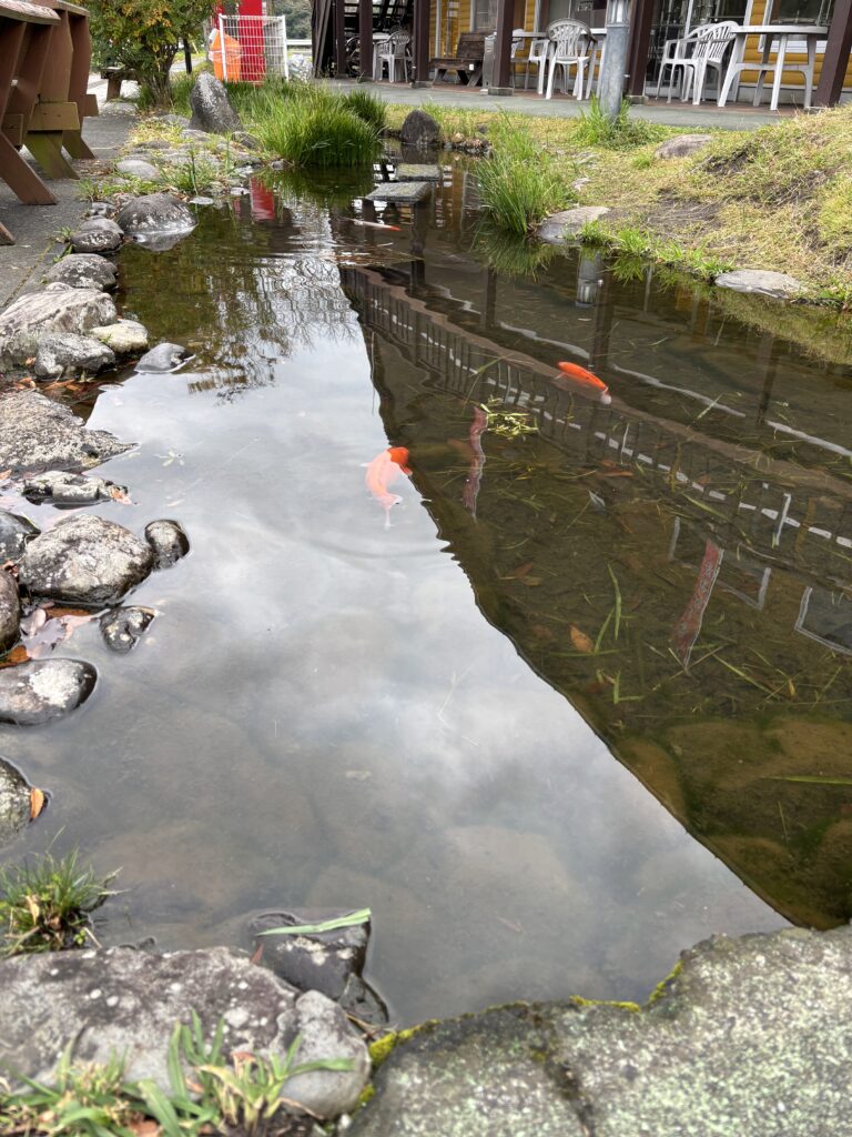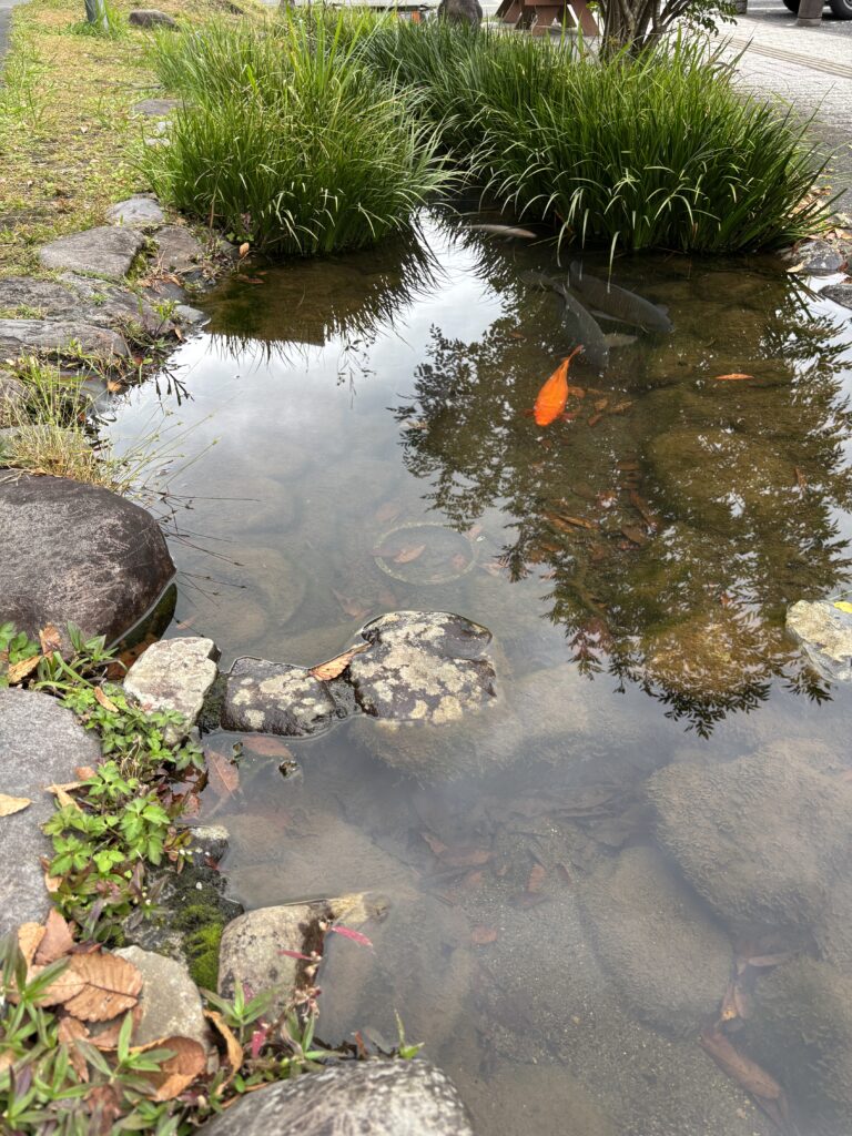 駐車場のすぐそば、エントランス近くには小さな池があり、色とりどりの鯉たちが優雅に泳いでいました🐠