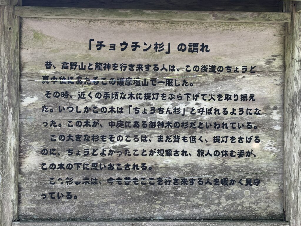 昔、高野山と龍神を行き来する旅人がこの場所(護摩壇山)で一服した際、近くの手頃な木に提灯をぶら下げて火を取り整えたため、いつしかこの木が「ちょうちん杉」と呼ばれるようになった。