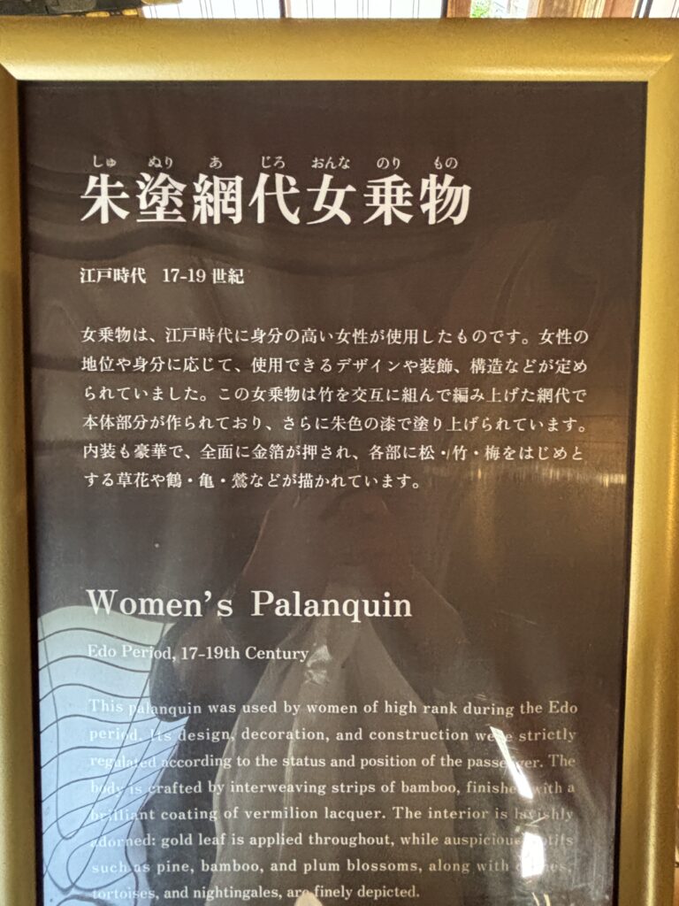 まず目についたのが、豪華な乗り物「朱塗網代女乗物(しゅぬりあじろおんなのりもの)」です😙