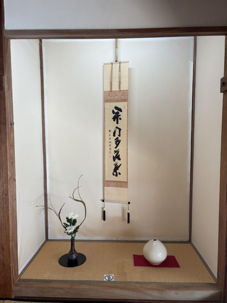 とある床の間には、掛け軸と活け花が飾られていました🏺達筆すぎて掛け軸に何が書いてあるか読み解けませんでしたが、花瓶に活けられた白い菊2本と、ユニークな枝ぶりの石化柳(せっかやなぎ)2本の組み合わせが印象的でした🤠
