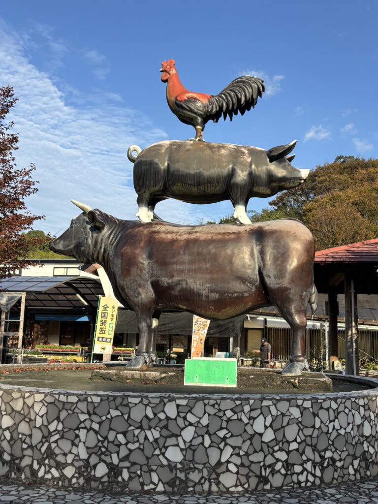 牛、豚、鶏の順番に乗っていて、思わず「ブレーメンの音楽隊みたい!」とツッコんでしまいました笑🤣🤣農業地帯らしい、なんともほのぼのした出迎えです😄