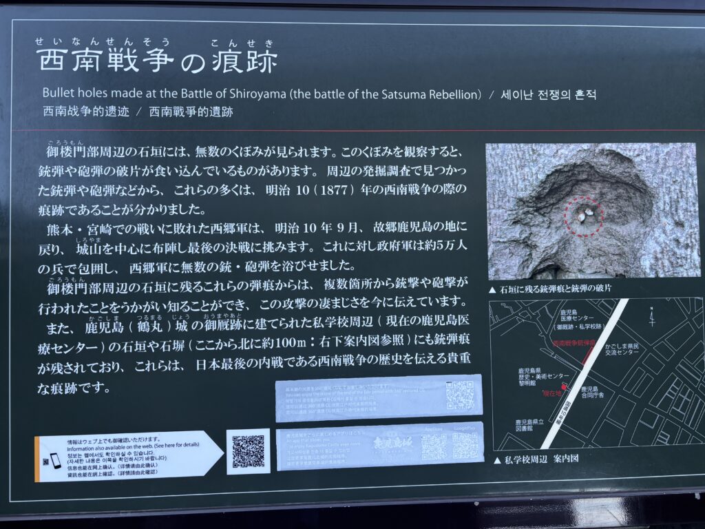 - 政府軍約5万人が城山を中心に西郷軍を包囲した際の、激しい銃撃戦や砲撃の跡😫