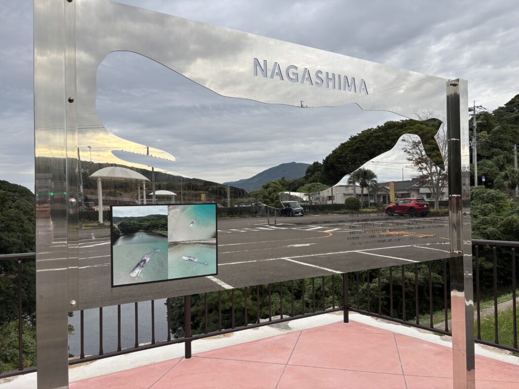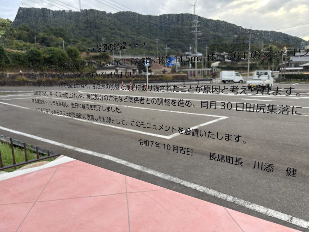 令和6年7月26日、ここ道の駅「黒之瀬戸だんだん市場」下の海岸に、体長14.5m・体重30tのマッコウクジラ1頭が漂着しました。残念ながらその場で力尽きてしまいましたが、長島町への漂着は過去に記録がなく、引き潮の影響で浅瀬に取り残されたことが原因と考えられます。関係者との調整を経て、同月31日に埋設が完了しました。この記録と、クジラへの追悼の意を込めて、このモニュメントを設置します。